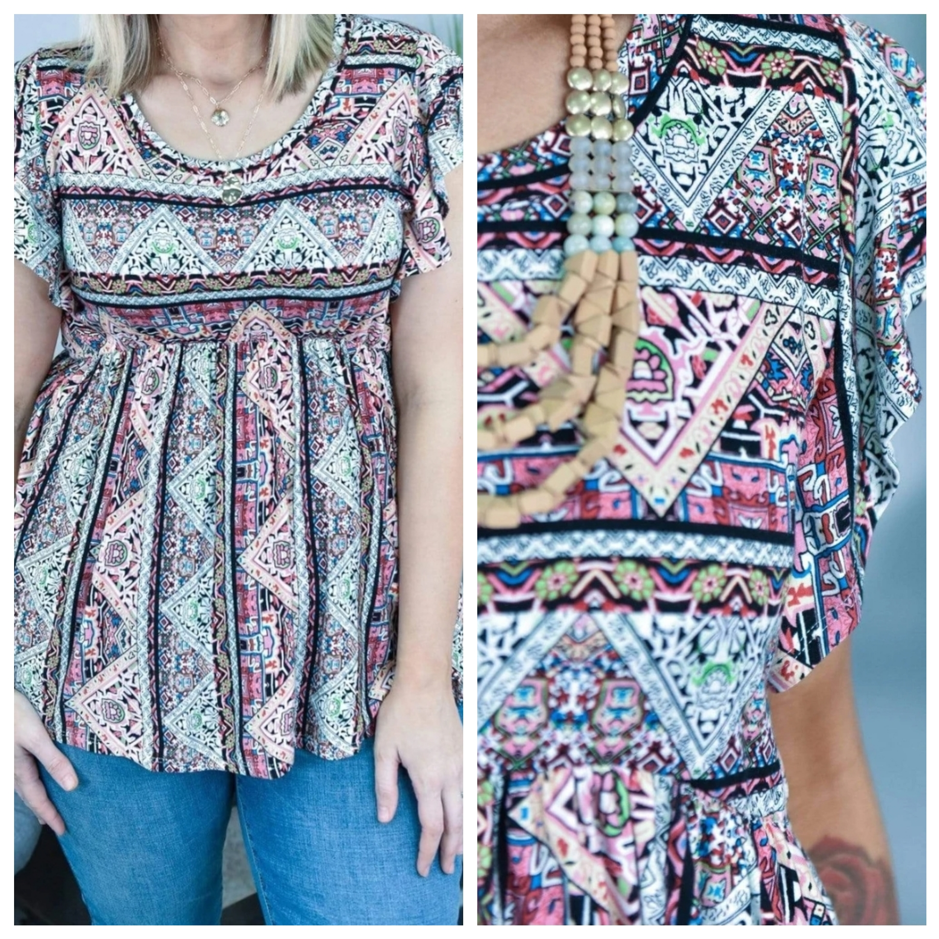Bohemian Rose Ruffle Sleeve Babydoll Top